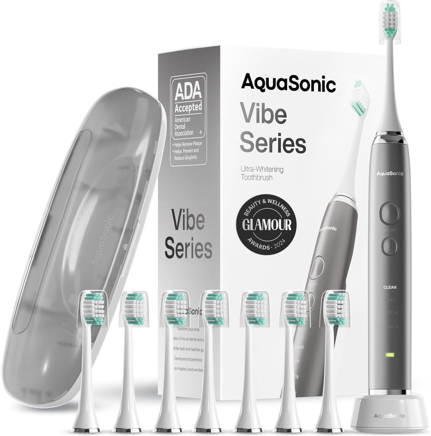 Aquasonic Vibe Series Ultra-Whitening Toothbrush – ADA Accepted Electric Toothbrush – 8 Brush Heads & Travel Case – 40,000 VPM Motor & Wireless Charging – 4 Modes w Smart Timer – Charcoal Metallic