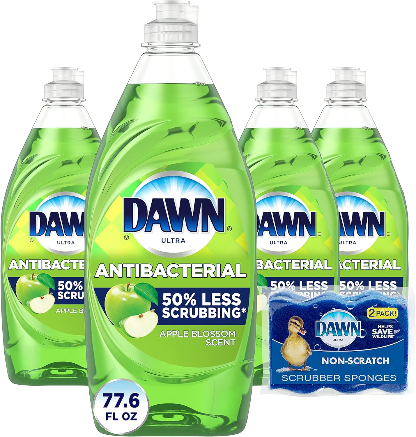 Dawn Dish Soap, Antibacterial Hand Soap, Dishwashing Liquid, Apple Blossom Scent,19.4 Oz, Pack Of 4 + 2 Sponges