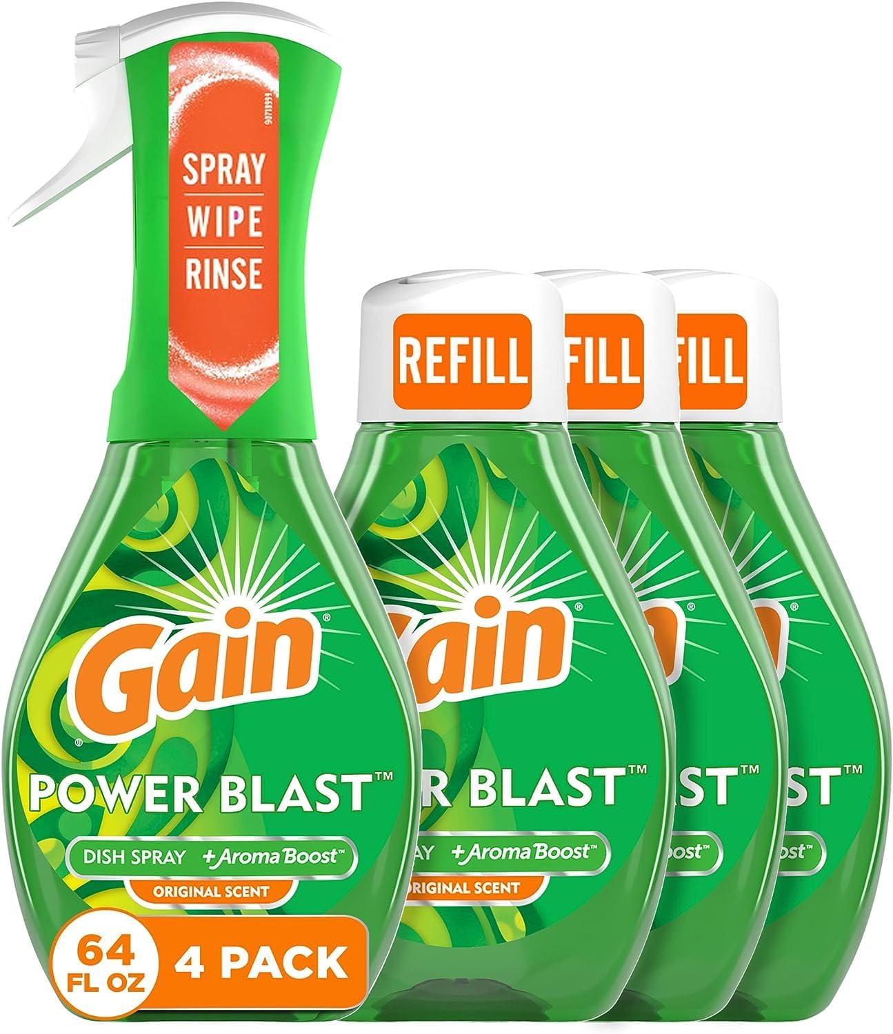 Gain Powerblast Dish Spray, Dish Soap, Original Scent Bundle, 1 Spray (16oz) + 3 Refills (16oz each)