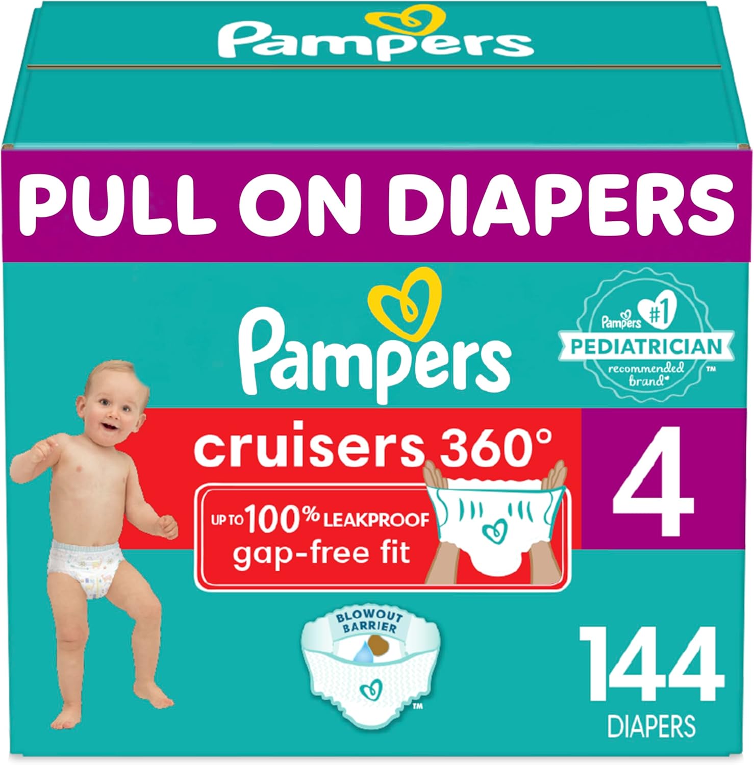 Pampers Cruisers 360 Diapers – Size 4, One Month Supply (144 Count), Pull-On Disposable Baby Diapers, Gap-Free Fit