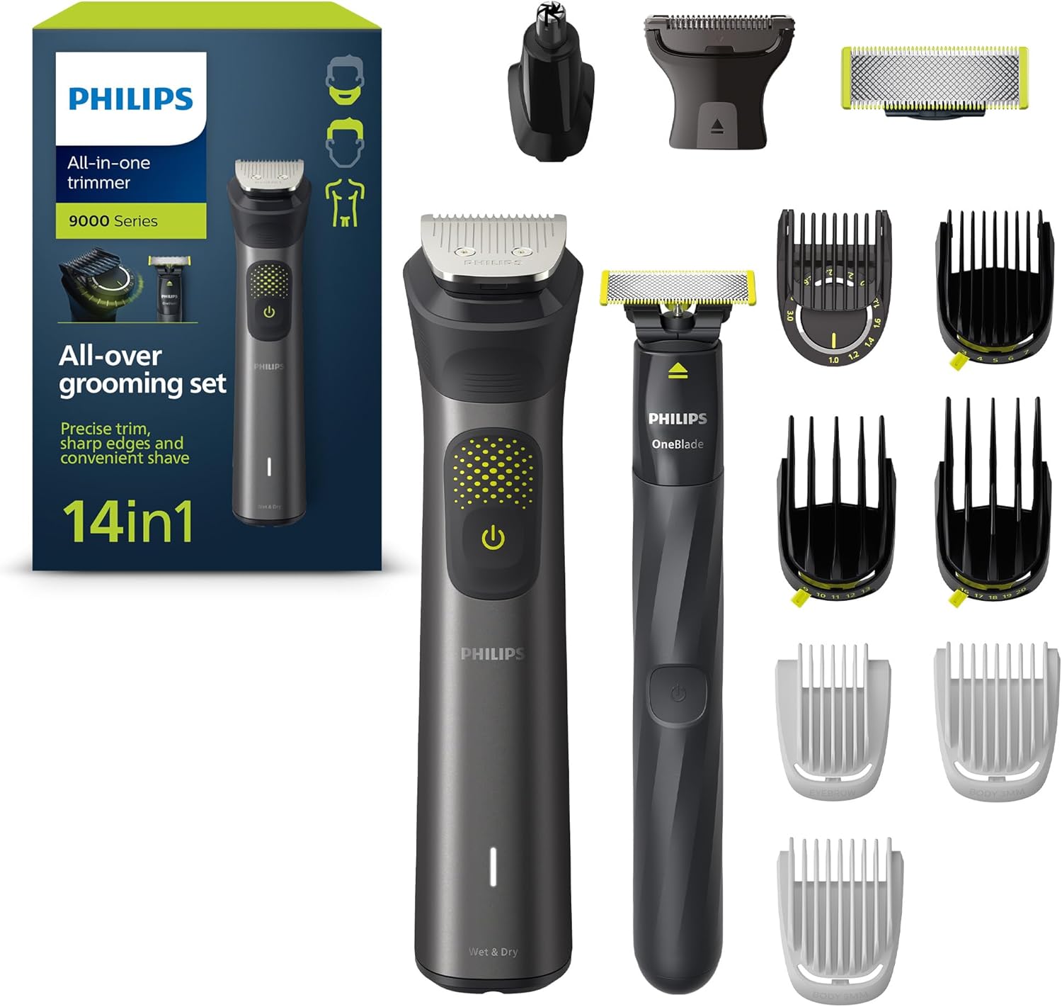 Philips Series 9000 14-in-1 trimmer + OneBlade, precision trimming, clean lines, comfortable shave, luxury pouch, extra OneBlade blade (model MG9550/15)