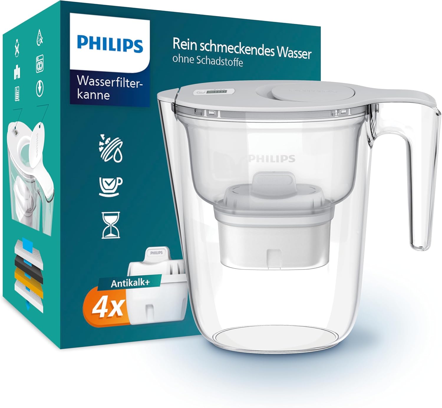 Philips Water Water Filter Jug + 4 Anti-Limescale + Replacement Filter Cartridges Fast Flow Electronic Timer Reduces Water Hardness by up to 50 Percent 2.6 L